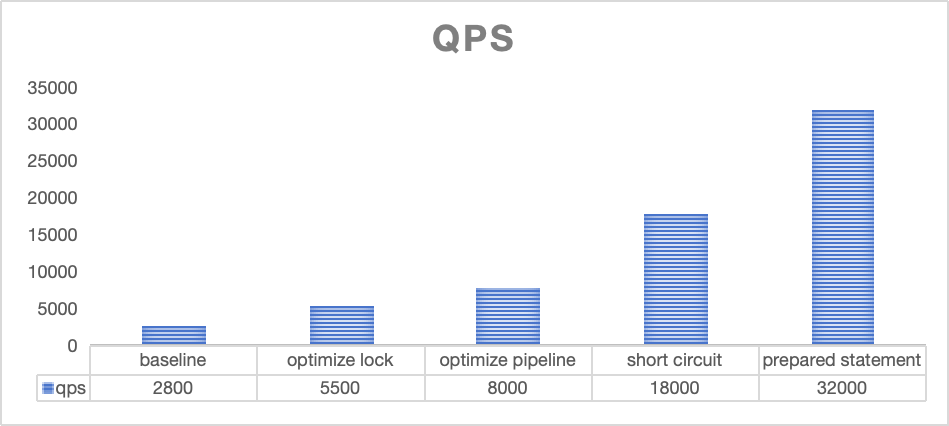 测试场景为 unique 表,点查query为用 unique 表的 key 为谓词。下图中展示了每个优化阶段完成后对应的 QPS 变化,baseline 表示的是未进行任何优化时候的表现