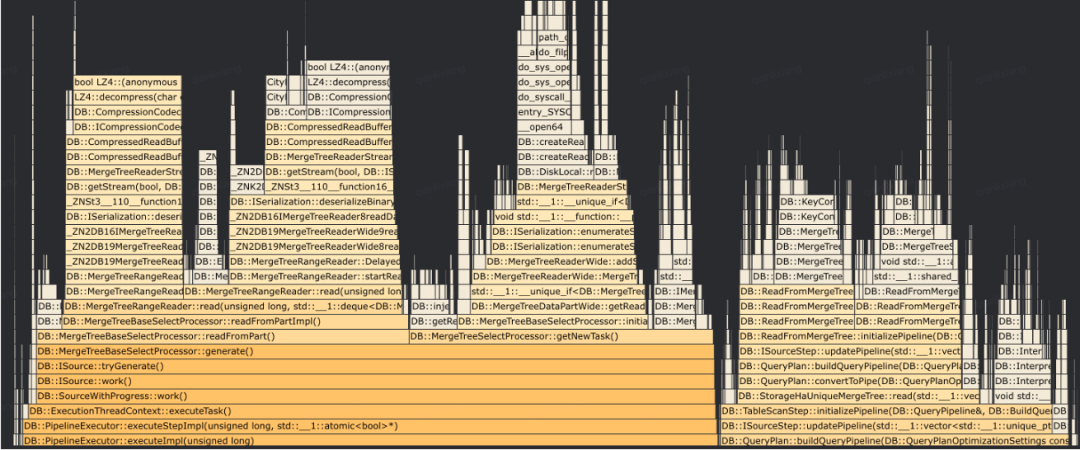 点查读放大严重:在下图中有很多decompress函数,对于通用的OLAP引擎,读一行数据通常也需要读取大量的block,再将block解压反序列化成内存格式,需要消耗大量的CPU资源。在高并发的场景下,点查读放大的问题更加突出。