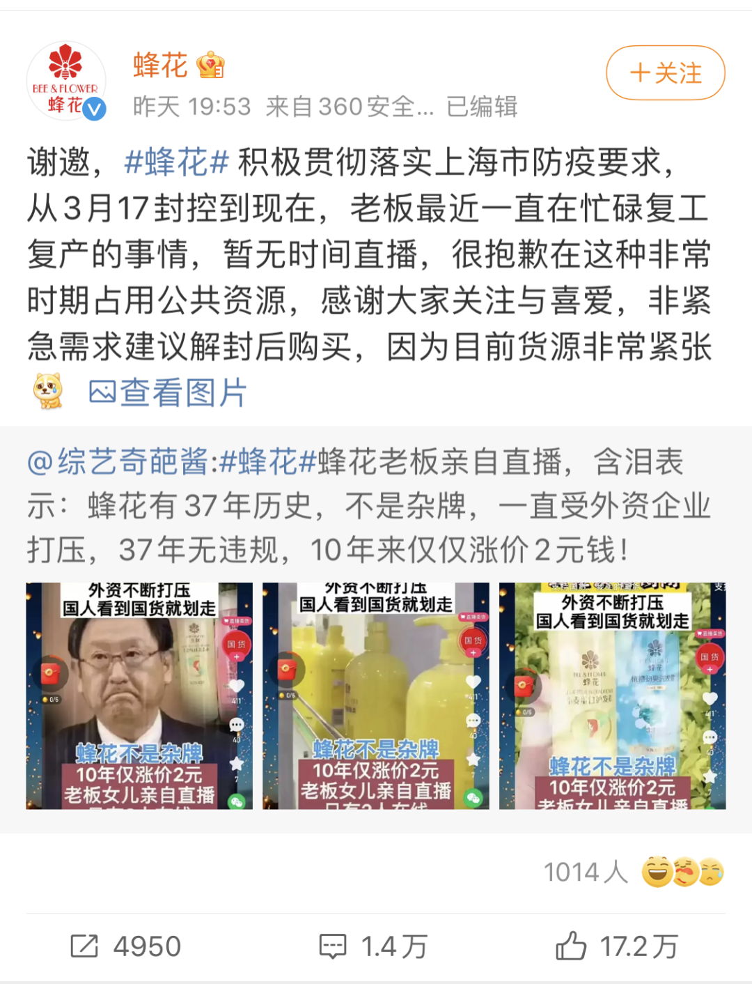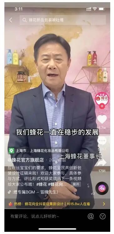 老板眼含热泪表示:蜂花有 37 年历史,不是杂牌,一直受外资企业打压,37 年无违规,10 年来仅仅涨价 2 元钱!”5 月 18 号晚上,蜂花官微下场打假:原来那位含泪直播的老板是李鬼。