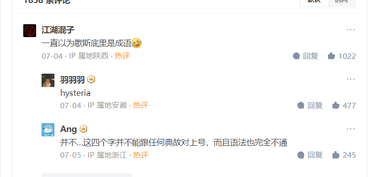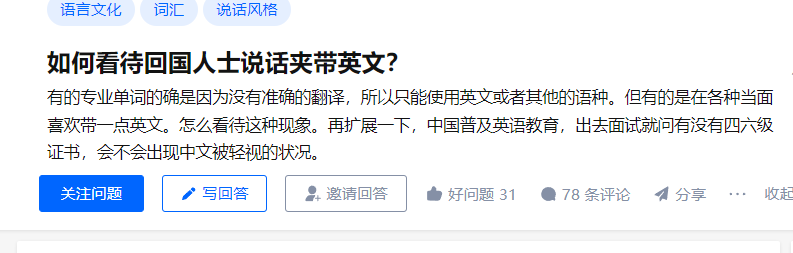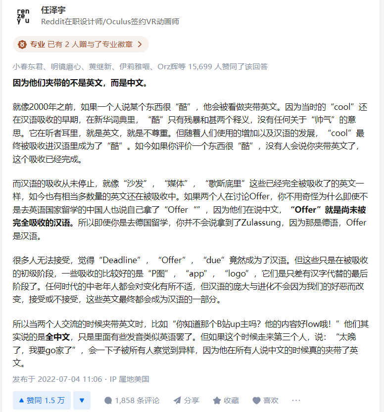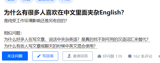 比如有人说「怎么不把这个PA给BAN了啊」相信没什么人会觉得不爽。但要有个中国人说「Today 我要go to 公司,拿my文件去你home」,大家多半会觉得这人精神有点问题。答主认为,除去那些刻意显摆讲英文的或是整句整句彪英文的,其实现在很多人夹的「英文」并不是英文,只是发音和英语类似的中文。 你觉得奇怪,是因为这些外来词还在被语言吸收的早期,还没有完全成为汉语的一部分。用得久了,你不但不会觉得奇怪,甚至还会以为这就是一个中文词。 比如「歇斯底里」,很多人以为这是古代流传下来的成语:很多词我们已经用习惯了,其实意识不到自己说的其实是英语,所以才会出现这样的评论:有意去查了查,发现已经被同化,完全融入我们日常用语的「外来语」还有很多。 比如我们吃完饭准备开发票,老板会让你把抬头给他。这个「抬头」,其实是「Title」的音译。 再比如我们觉得一个人很有趣,会说「你真幽默」。这个「幽默」也是「Humour」的音译。 ![]()