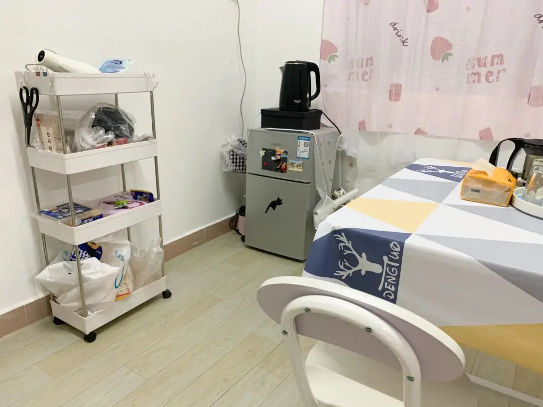 小鱼租的房间有15平米左右,有一张床、一个衣柜、一张桌子、一台空调,卫生间里有马桶、热水器,冬天供暖夏天供冷都没问题。她自己另外添置了冰箱、洗衣机。