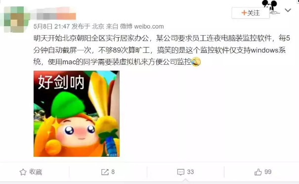 为了让自己的员工“即便在家也能保持效率”,有公司要求员工全天开视频,还有的则直接要求全员装监控软件,每5分钟截屏一次,一天考勤不到89次就算旷工。