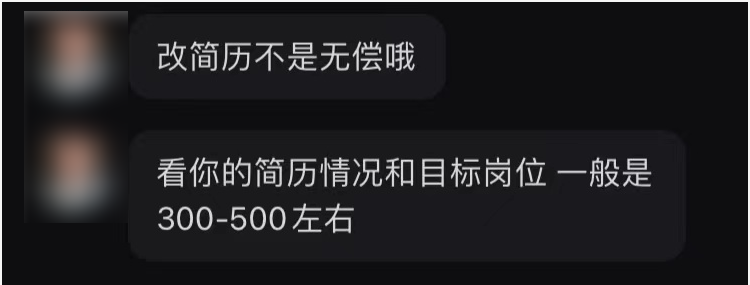在第一篇笔记获得 1.3 万点赞之后,该博主便开始了变现之路。她说,「简历精修」服务是依据客户的当前简历情况和目标岗位来判定该收取多少费用,客单价一般在 300-500 元左右。