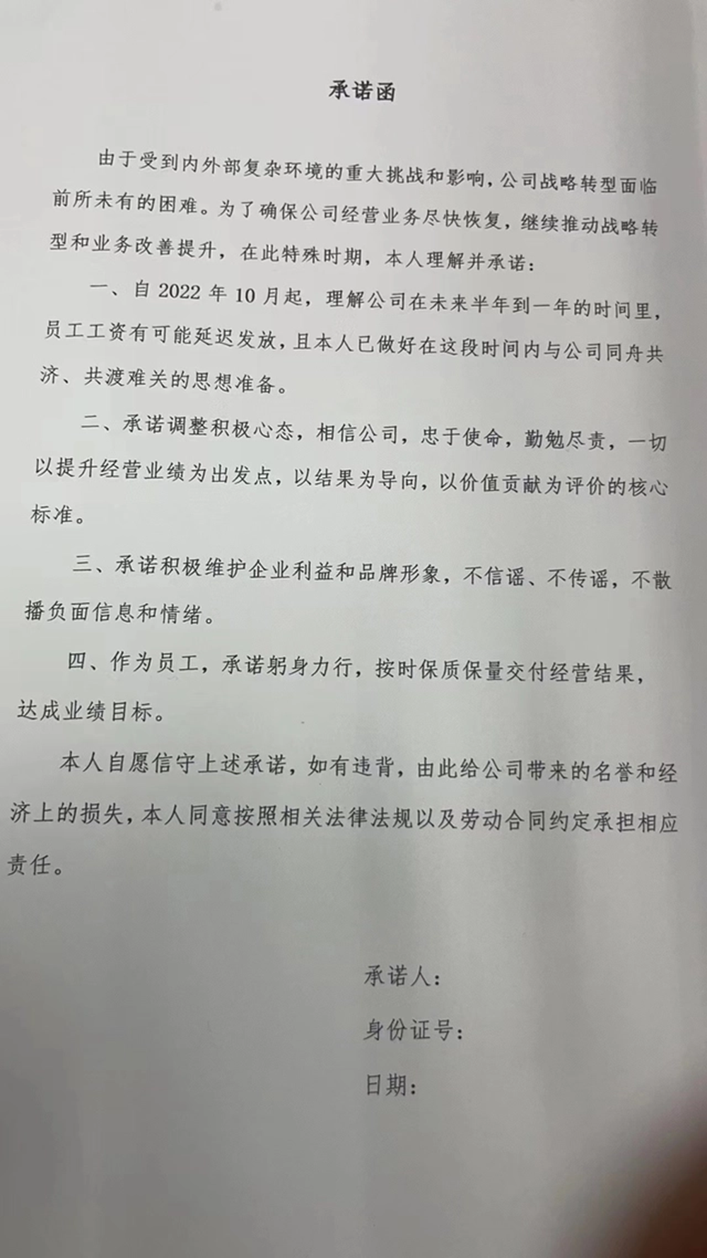 国美拿出了一份自愿接受延迟发工资的承诺书,要求员工签字画押: