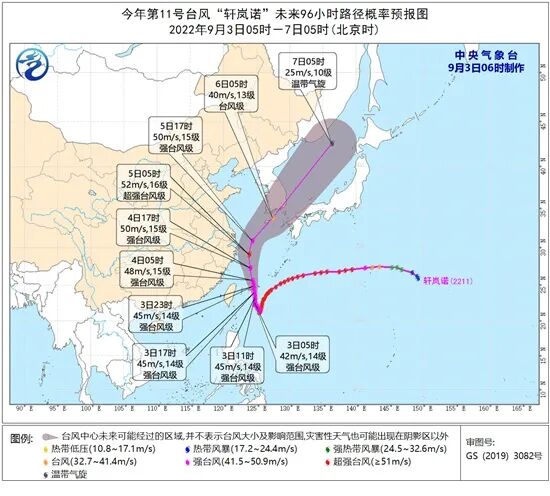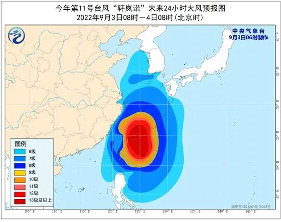 央气象台9月3日06时继续发布台风黄色预警。今年第11号台风“轩岚诺”(强台风级),今天(03日)08时中心距离浙江省舟山市朱家尖岛南偏东方向大约840公里的洋面上,就是北纬22.8度、东经124.7度,14级(42米/秒),955百帕。预计“轩岚诺”将以每小时15公里左右的速度向偏北方向移动,强度逐渐增强。