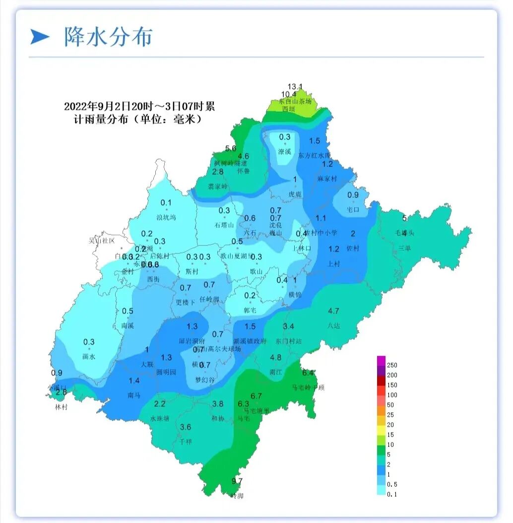 9月2日20时至9月3日07时,全市平均面雨量2.1毫米,排名前三的分别是:东白山茶场13.1毫米、西垣10.4毫米、岭脚9.7毫米。