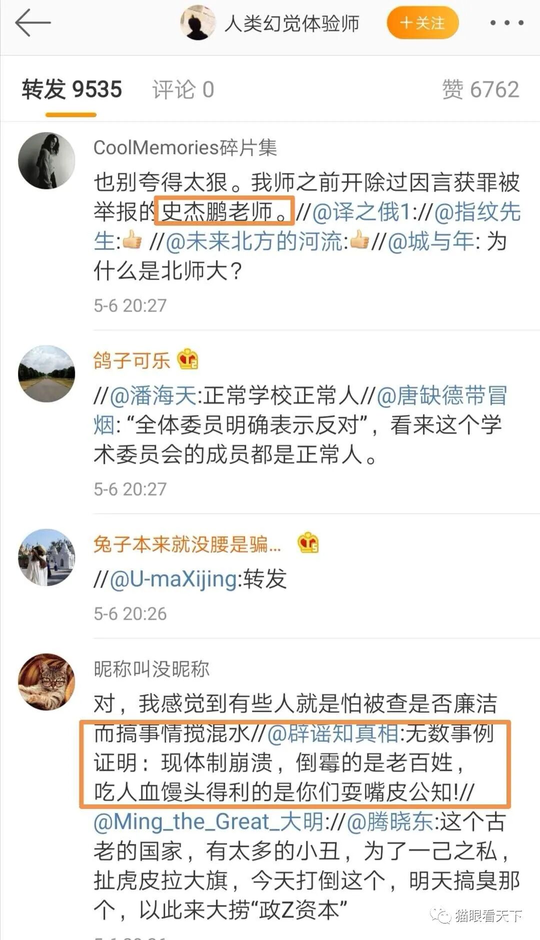 这个帐号为人类幻觉体验师帖文的真实性很值得怀疑,既然是北师大全体学术委员会委员一致决定认可的,为何要通过这么一个来历不明(大量帖文标注地址为英国)的帐号玩这么一出?(有兴趣可以看一看此人关注的6个帐号都是些什么人)