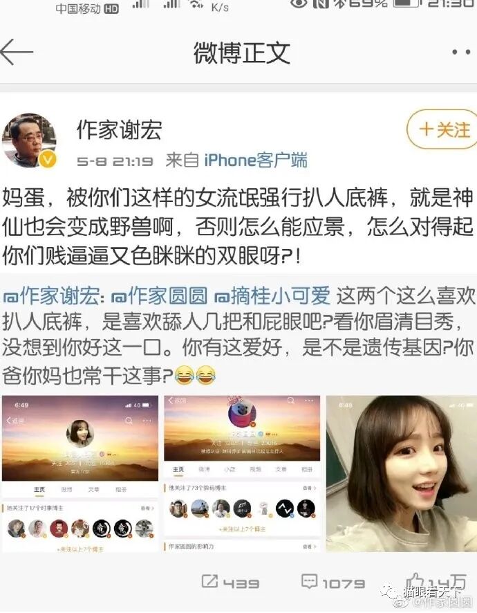 那个流氓作家谢宏,我们只是把他说的话晾出来他就无耻下流的来骂我们了。究竟是谁骂谁呢?