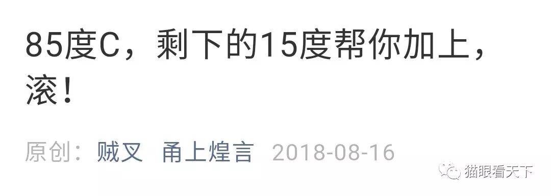 贼叉:2017年,摄氏85度在全球营收折合人民币约51亿,其中大陆贡献约20亿。你们常凯申将军的一句口头禅:拿着大陆的钱,去给你们的伪总统送大礼包?民族大义,血浓于水,实在是懒得讲了。最朴素的一个道理,你吃我的用我的还要骂我不好,对不起我就不惯着你了。不是85度的时候口感好么?来,我再加一把柴火,送你那剩下的15度:滚!