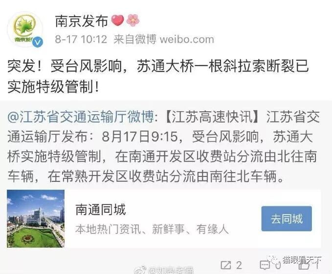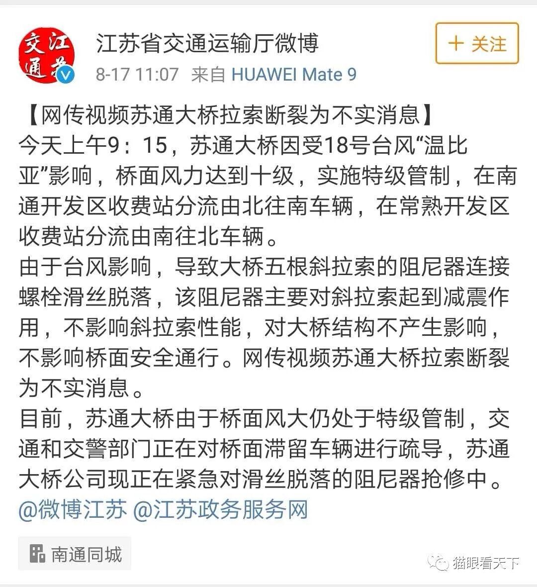如皋老猫:造谣传谣的媒体们呢?在风雨中凌乱?难道他们是多么希望索断桥毁人亡事故发生么?斜拉索断裂与阻尼器连接螺拴滑落,完全是两个概念。澎湃等媒体急不可耐发布新闻称斜拉索断裂,是什么用心?
