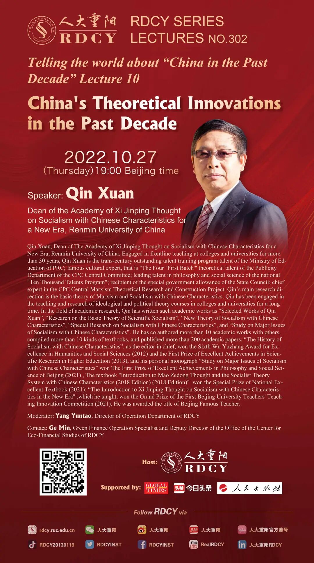 Speaker: Qin Xuan, Dean of The Academy of Xi Jinping Thought on Socialism with Chinese Characteristics for a New Era, Renmin University of China