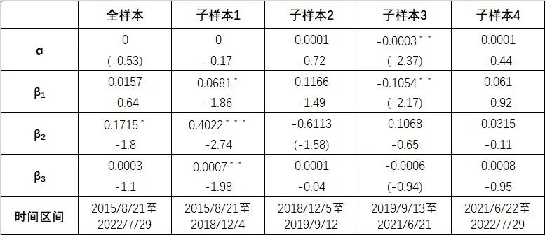 (3)子样本1中,β3显著为正,说明交易量大幅增长(超出过去21天均值)的情况下,市场对贬值的敏感性较强。但之后的子样本中,交易量与汇率无明确的关系,符合理论与国际经验。