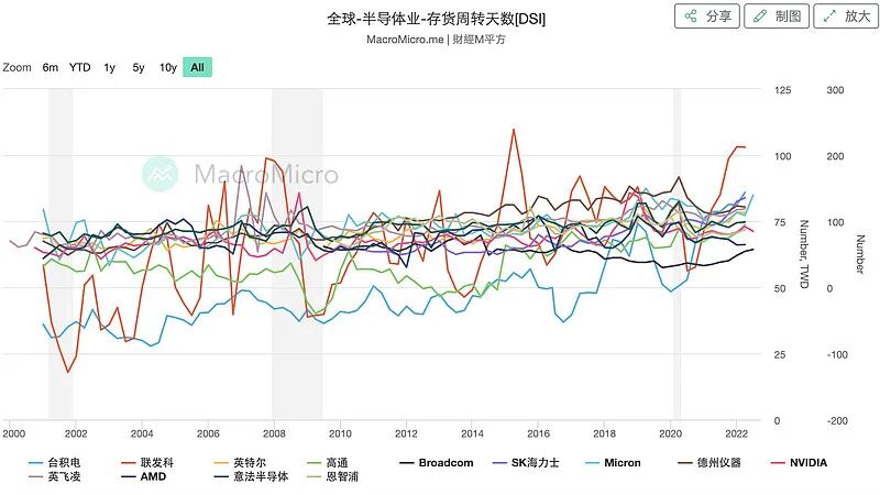 据SIA数据和中信证券的研究,2022Q2,全球半导体库存天数约为108天左右。从半导体行业库存水平来看,大概率已经在今年的Q3见顶开始回落,因此股价有可能在明年上半年产能去化后会见底回升。不过我查询了半导体的库存天数,但是并没有发现什么明显的规律,所以半导体的周期是挺难把握的。