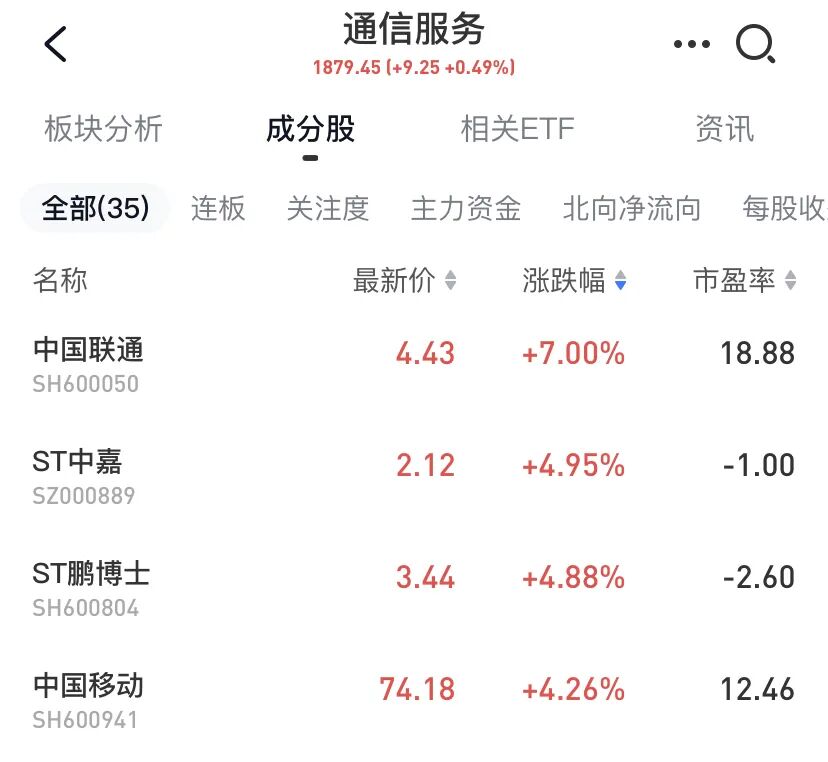 通信服务板块午后持续拉升,截止发稿,中国联通涨7%,盘中一度冲击涨停,中国移动涨超4%,中国电信、华星创业、立昂技术、纵横通信等跟涨。
