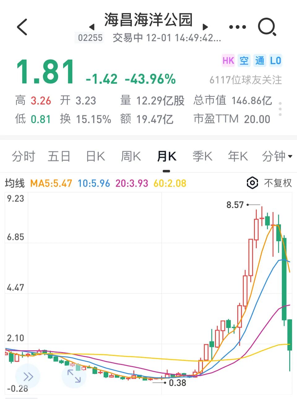 一年多的时间里,港股海昌海洋公园曾上演了20倍的暴涨神话。其股价从2021年11月的0.38港元/股,升至今年6月的8港元/股,其中在7月29日最高点,盘中触达历史最高点8.57港元/股。