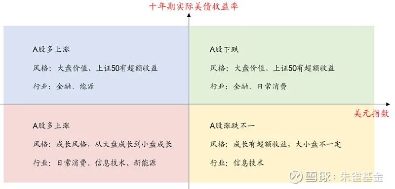 招商证券做了一个四象限组合,当流动性主导驱动的十年期美债收益率下行叠加美元指数下降的时候,往往是流动性好转、提估值,对应着A股上涨,未来成长确定性较高、成长空间大的行业会明显受益。行业上利好新能源、日常消费与信息技术。