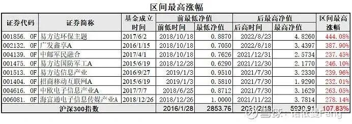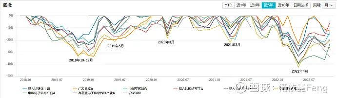 8只基金均在2015年6月19日(有2只基金成立)及之后成立,净值最低点均发生在2018年和2019年初,净值最高点均发生在2021年三季度至2022年三季度之间。区间最高涨幅,最少的招商移动互联网A为232.01%,最多的易方达环保主题444.08%。均远超沪深300指数,最少的超一倍、最多的超三倍。