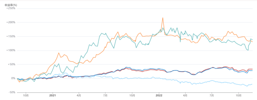 原因大概有以下几点:(1)很多主观策略管理人,经过这一轮牛熊,收益依然非常靓丽,下图展示了两家相对头部的主流(之所以强调主流,是因为有较长历史业绩,可研究性更强)主观策略管理人(橙色和青色)和两家头部的量化管理人(红色和深蓝色)的曲线对比。