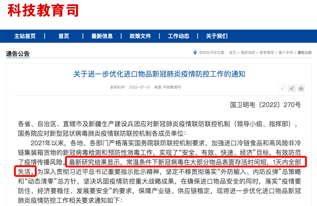 《关于进一步优化进口物品新冠肺炎疫情防控工作的通知》。虽然这则《通知》针对的是“不再对进口的非冷链物品核酸检测”,属于为贸易减负,和普通老百姓的日常生活关系不大。常温条件下,新冠病毒在大部分物品表面存活时间短,1天内全部失活。也就是说,新冠病毒离开活体,常温条件下最多“苟延残喘”24小时。这个本不复杂的实验结果,终于在新冠爆发后的第三年,被卫健委公布出来了!真是晴天霹雳!折腾百姓这么久的病毒,3年后砖家才发现“病毒在体外活不过一天”,那之前的户外消杀、无休止的大规模核酸检测,岂不是白费功夫?