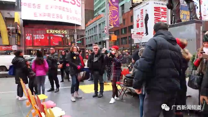 表演快闪的这些姑娘小伙都是来自环江毛南音韵艺术团。之所以会出现在纽约时代广场,是受到美国纽约花开时节国际文化传媒有限公司的邀请,到纽约进行文化交流。