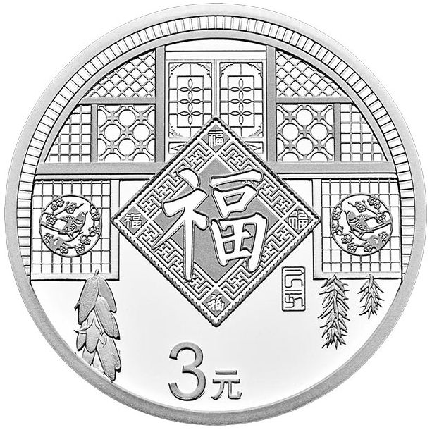 其中,银质纪念币为普制币,面额3元,含纯银8克,成色99.9%。它的背面图案为“福”字造型,配以窑洞、窗棂、玉米、辣椒等造型组合设计,并刊面额,由中国金币总公司总经销。