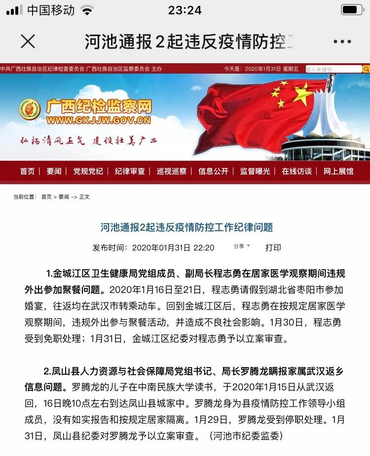 1月31日22点20分,河池市纪委监委发出通报,河池市金城江区卫生健康局党组成员、副局长程志勇,凤山县人力资源与社会保障局党组书记、局长罗腾龙因违反疫情防控纪律,分别被免职、停职。