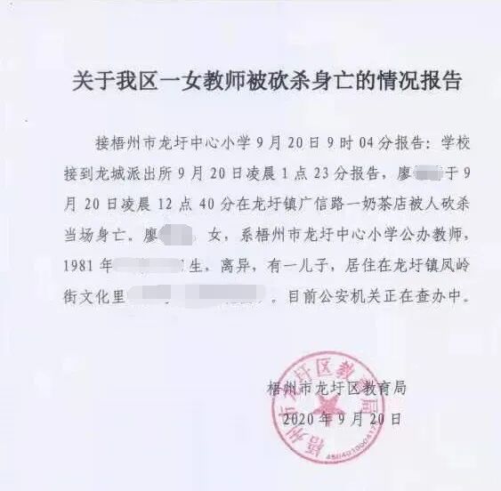 9月20日,梧州市龙圩区教育局发布一则《关于我区一女教师被砍杀身亡的情况报告》通报称,接梧州市龙圩中心小学9月20日9时04分报告∶学校接到龙城派出所9月20日凌晨1点23分报告,廖某于9 月20日凌晨12点40分在龙圩镇广信路一奶茶店被人砍杀当场身亡。廖某,女,系梧州市龙圩中心小学公办教师,1981年生。目前公安机关正在查办中。