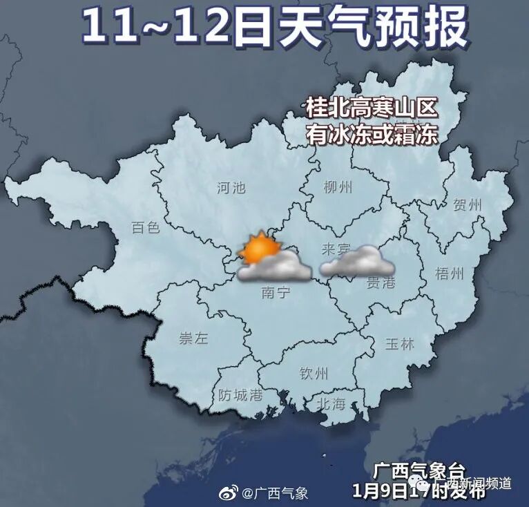 11-12日,全区多云到阴天,桂北高寒山区有冰冻或霜冻。受冷空气影响,各地气温下降2~4℃。