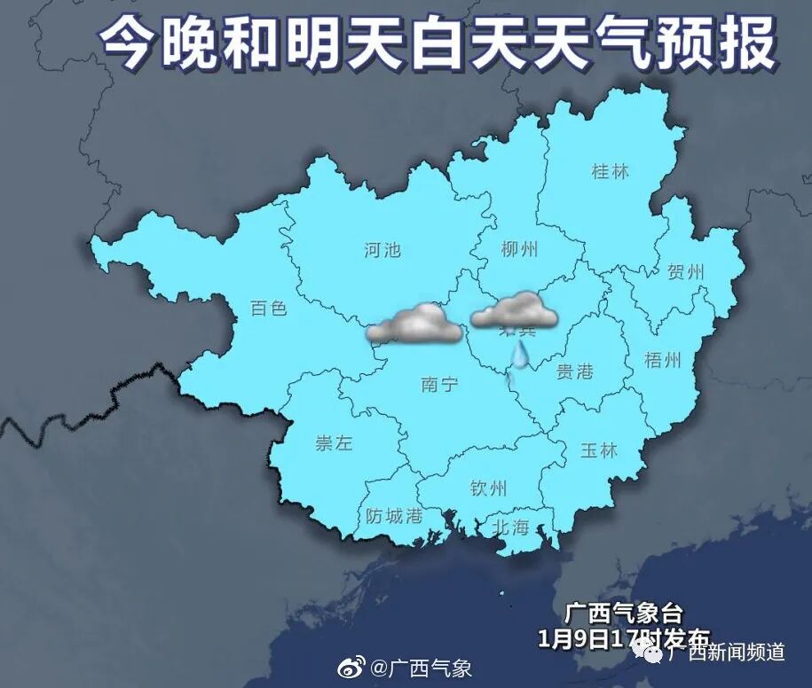 南宁市:今天晚上到明天白天,阴天有小雨,东北风1~2级,最低气温10℃,最高气温13℃。