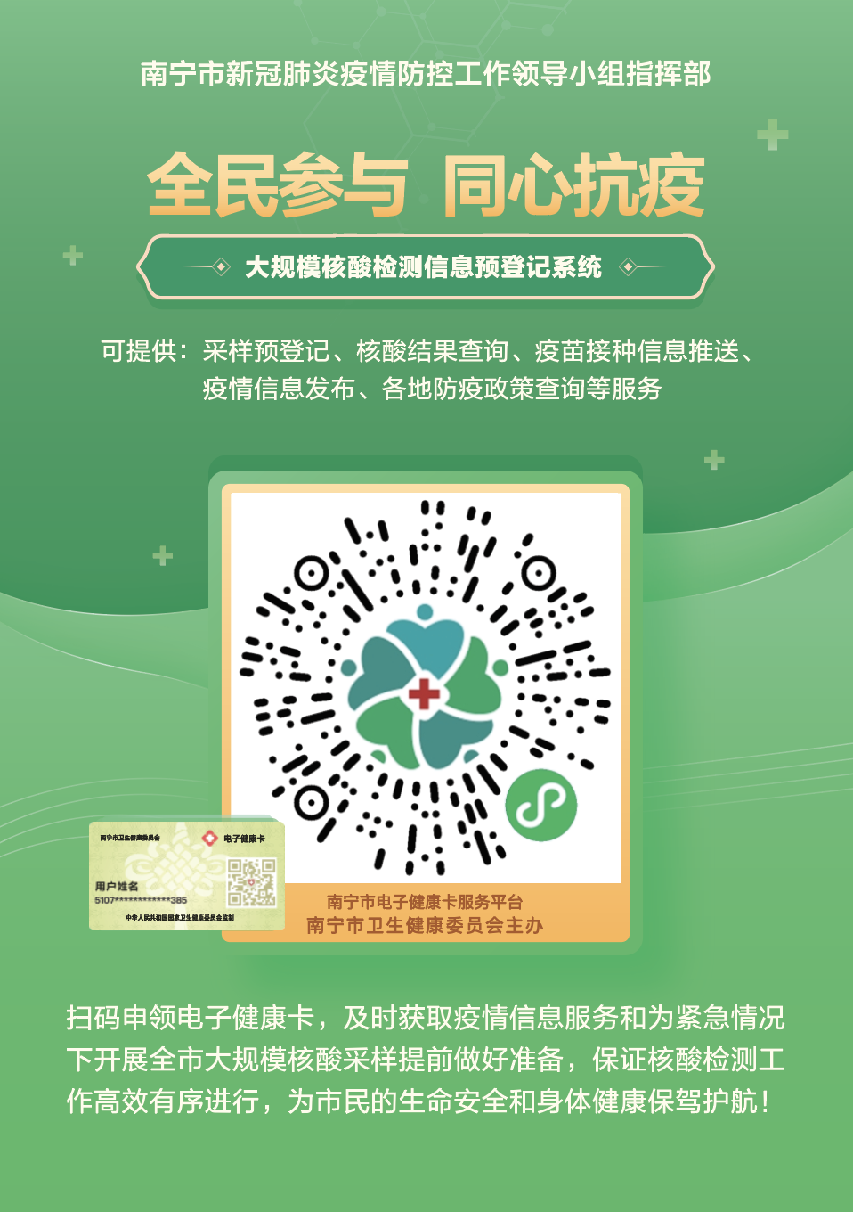 (1)扫码或搜索微信小程序 “南宁市电子健康卡” | (2)电子健康卡二维码(核酸检测时出示) |