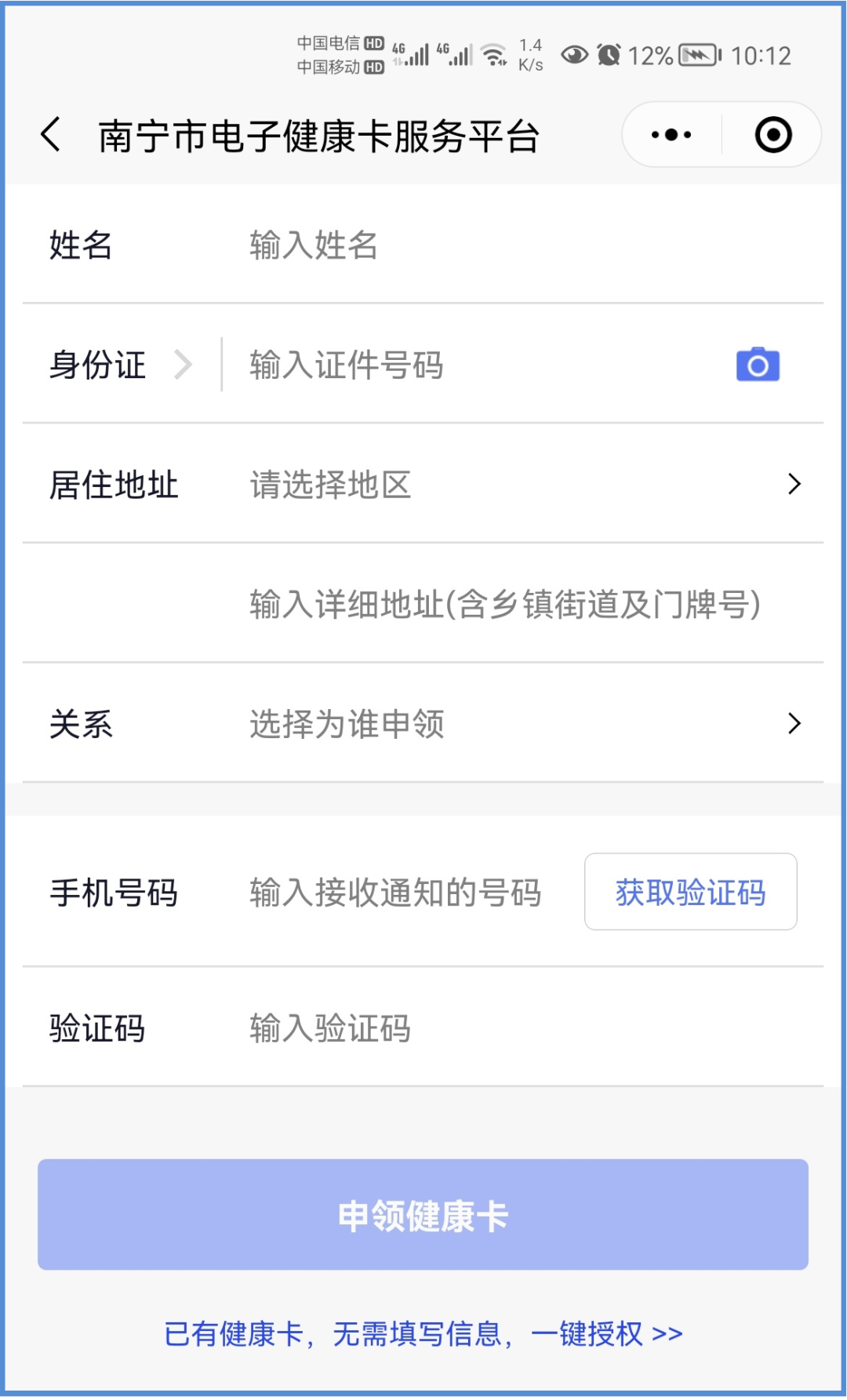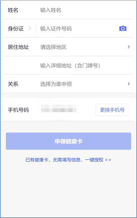 点击“+”申领电子健康卡,点击“允许使用”,填写身份信息,“一键获取”或填写手机号,经过实名认证后即可领取电子健康卡(二维码),即完成信息预登记。