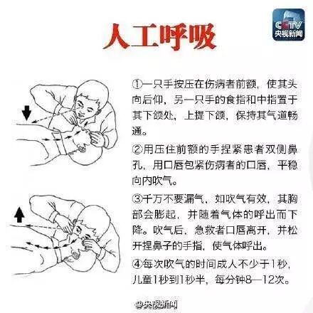 ③人工呼吸时,捏住病人鼻子,用你的嘴包住病人的嘴吹气。
