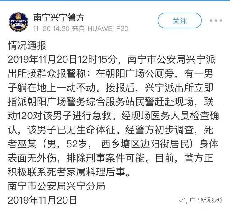 经过警方进一步调查发现,死者姓巫,是南宁市西乡塘人,五十二岁,经医务人员检测,男子身体表面无伤,死因为病理性死亡,目前警方已经联系死者家属料理后事。