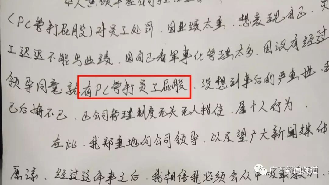 两位组长坚持视频中被体罚的人并无普通员工,可在他们昨天写下的检讨书中,却都出现了“用PVC管打员工屁股”、“对员工行为过激处罚”等字眼。