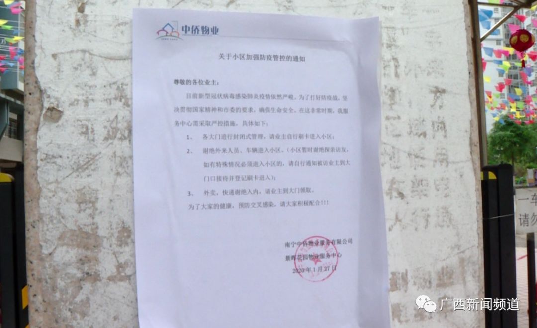 记者 梁钊:我现在是在南宁市的景晖花园小区门口,现在小区物业已经对这个小区做了严密的防控措施,所有进出小区的人员都必须要经过详细的登记并且测量体温消毒。