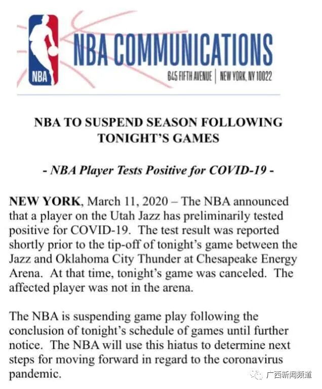 据NBA官方确认,2019-2020赛季暂停。目前爵士中锋戈贝尔已被确诊为新冠肺炎。