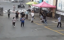 黑衣男子身材高大,动作敏捷,与两侧路人擦肩而过,先跑了出去。身后那位白衣男子紧跟其后,就在离大门差几米路的时候:一位穿白衣的大伯,突然脚步一稳,伸出左脚对准了他。白衣男子失去重心躺到地上。
