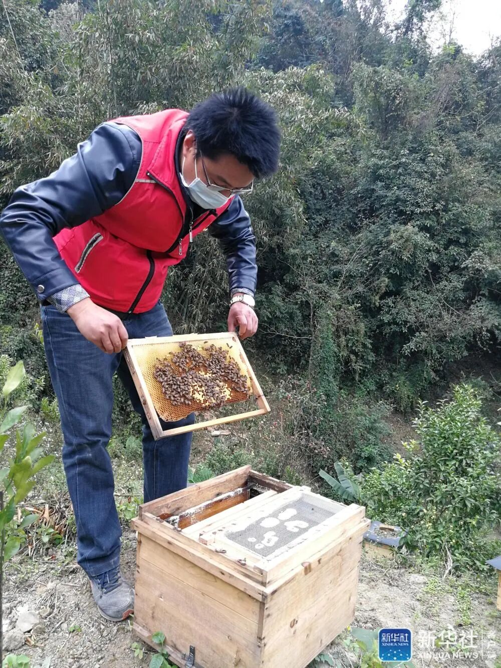 ↑2月26日,广西百色市乐业县百坭村驻村第一书记杨杰兴在查看村里养殖的蜜蜂。新华社记者 何伟 摄