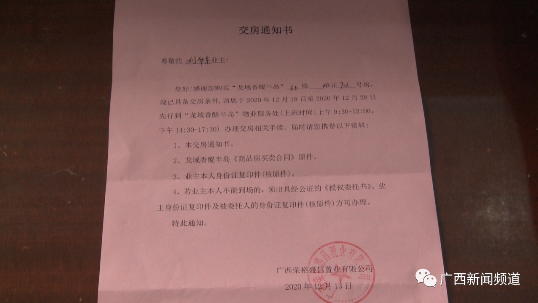 小区开发商的广西荣裕盛昌置业有限公司一名工程部负责人说,按原计划今天的确是小区65、66号楼交房的日子,可办理五方验收的过程中了点小问题,交房还要再等等。