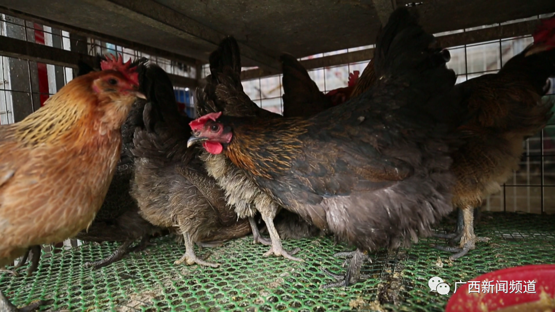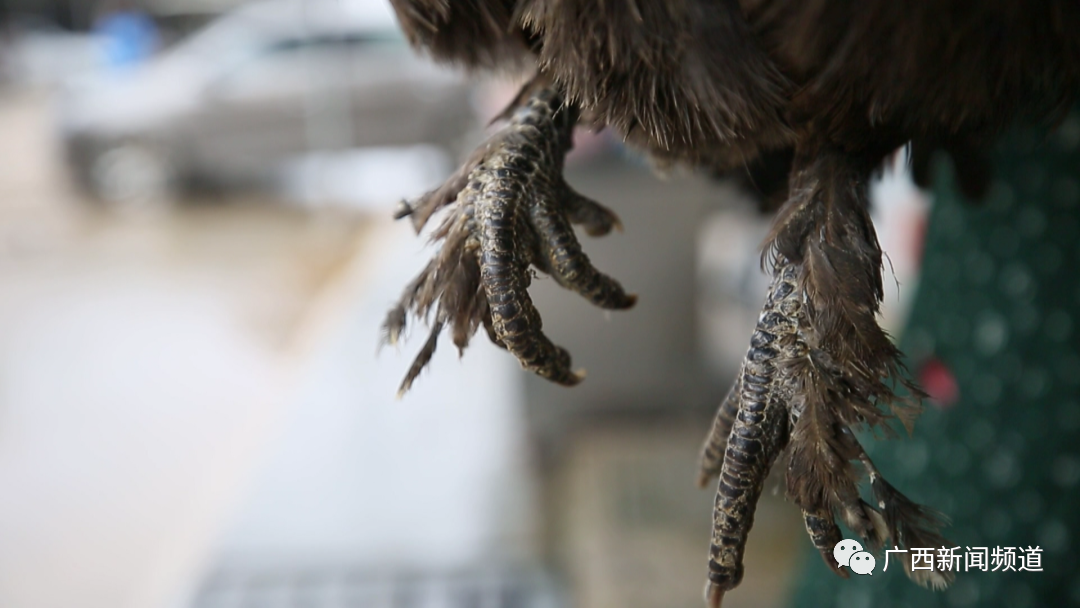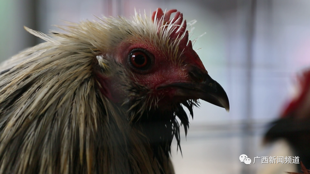 南宁农产品交易中心畜禽市场经营户 韦姐:这个是叫凤鸡,桂林龙胜原种凤鸡。它跟其他普通鸡完全不一样,你看它的外表有胡子,有脚毛的