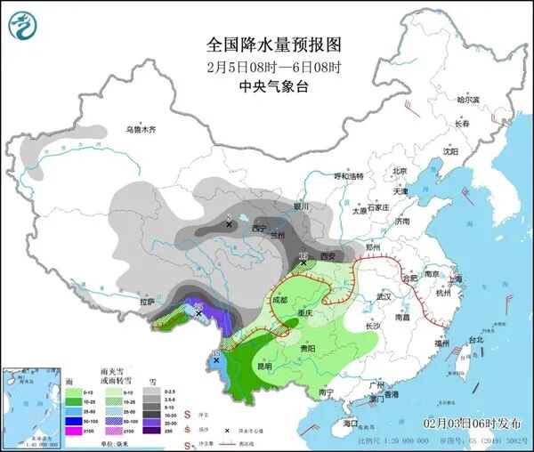 中央气象台预计,2月5日至7日,西北地区、华北西部、黄淮西部和南部及其以南的大部地区将有一次大范围雨雪天气过程,雨雪分界线位于云南北部、贵州南部、江南西部和北部一线;届时甘肃、陕西、宁夏、河南、湖北、湖南、安徽等地部分地区将有大到暴雪,江南、华南有中到大雨,局地暴雨。贵州东部、湖南西部局地有冻雨。