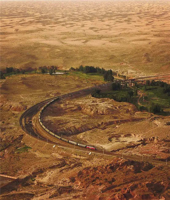 包兰线列车在沙坡头绿色防护带中通过腾格里沙漠