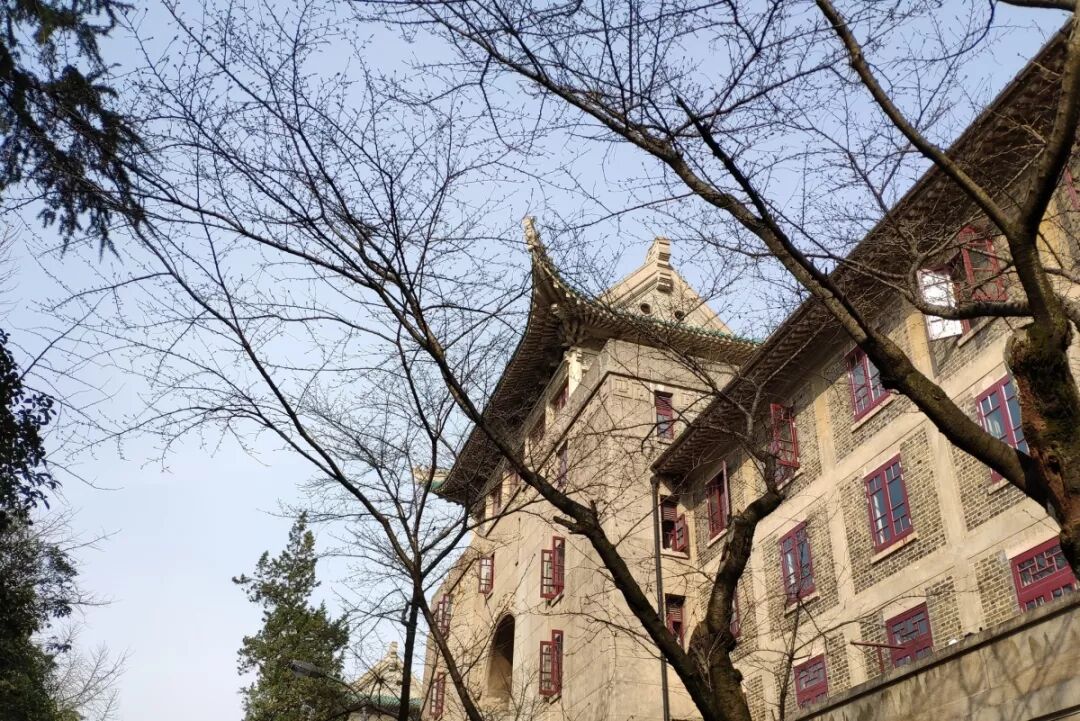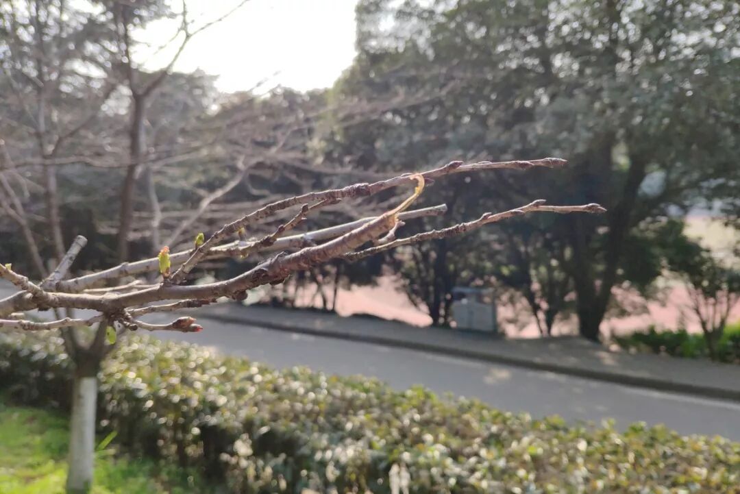 文中的早樱位于校医院旁边和珞珈广场,由于品种原因开放较早。大家所期待的樱花大道、行政楼附近的樱花还没有开放喔。看,现在它们还是这样的: