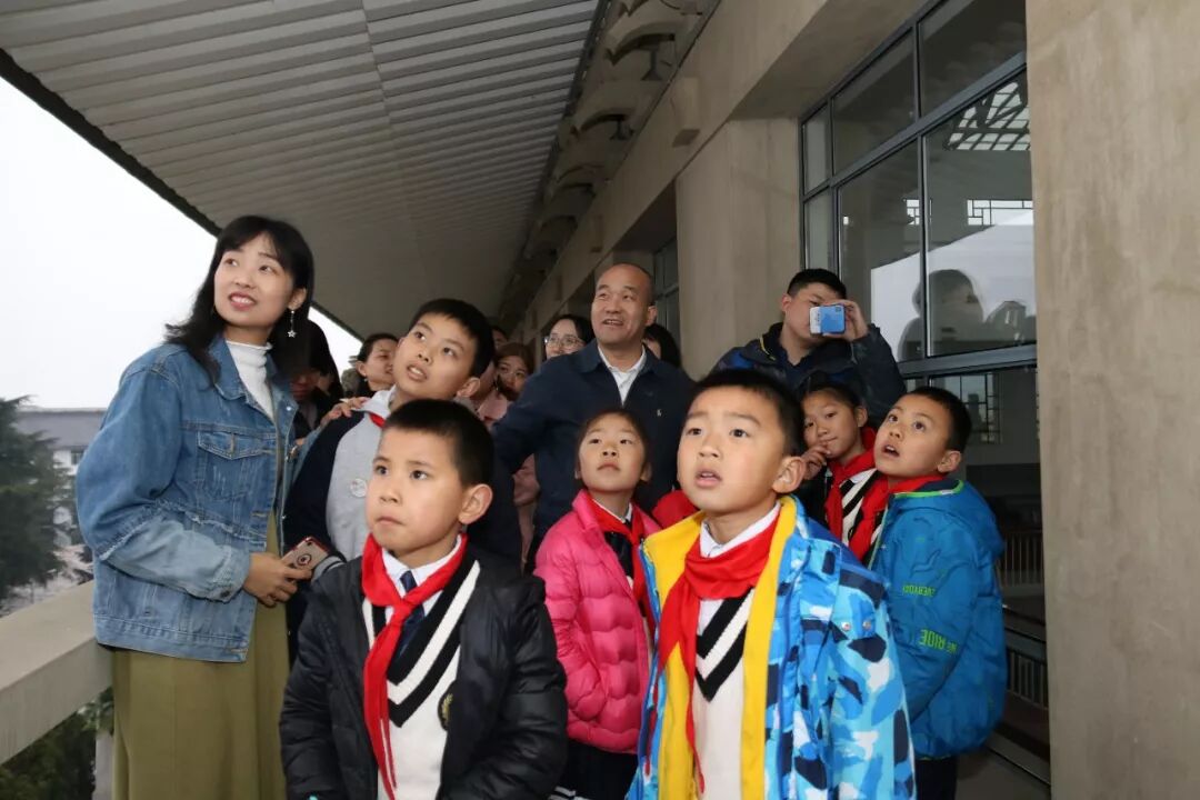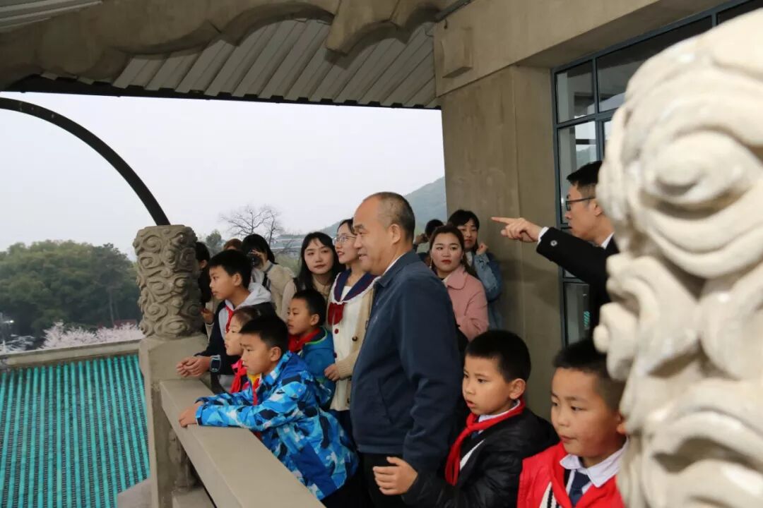 窦贤康为好奇张望的小学生们介绍行政楼的历史、设计者、中西合璧的建筑风格,让他们看看头顶碧瓦飞甍,拍拍身前雕栏画柱,一起远眺珞珈山,听大学生志愿者讲解“珞珈”之名的由来。