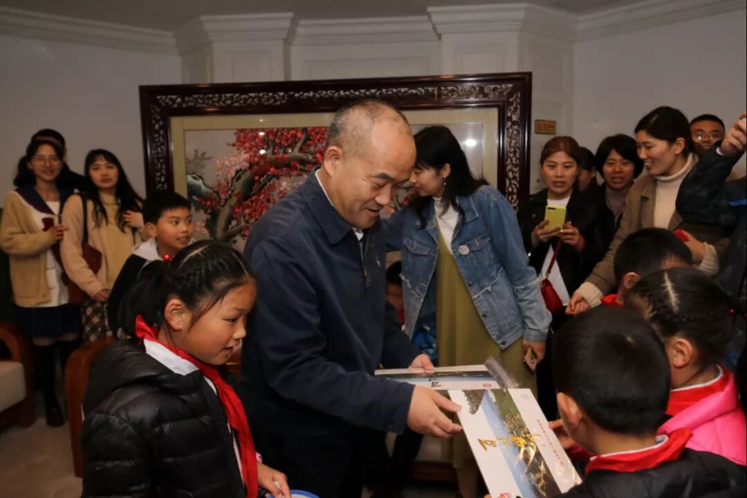 参观行政楼后,窦贤康赠送小朋友们每人一本武汉大学一百二十周年校庆纪念邮册《百廿黉门》,并合影留念。