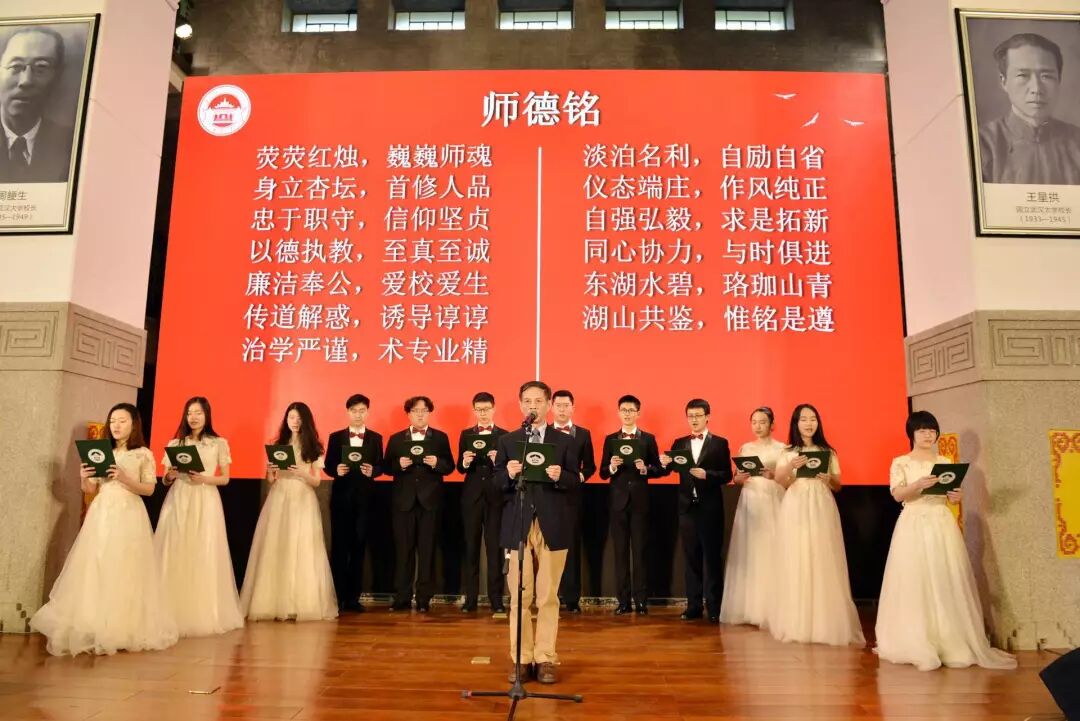 “荧荧红烛,巍巍师魂,身立杏坛,首修人品……湖山共鉴,惟铭是遵。”全体师生起立,在马费成教授的领诵下,齐声朗诵《师德铭》。