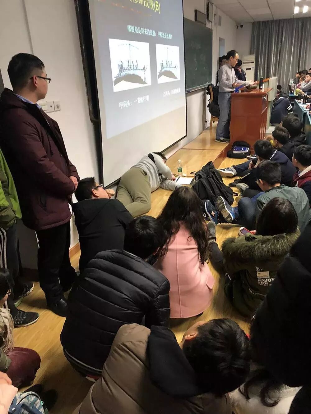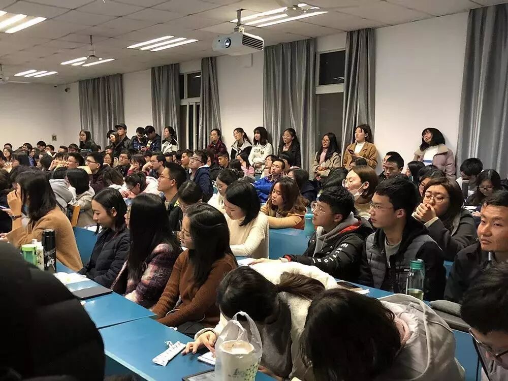 周四晚上7点,武汉大学教5楼的404教室,前门开着,有几个学生站到了走廊里,头朝教室里面看着;后门也开着,却也被几个站着的学生堵上了。从走廊踮脚往里看,教室四周站了一圈学生,手里捧着笔记本;过道里也坐着学生,抱着书包,聚精会神地看向黑板。