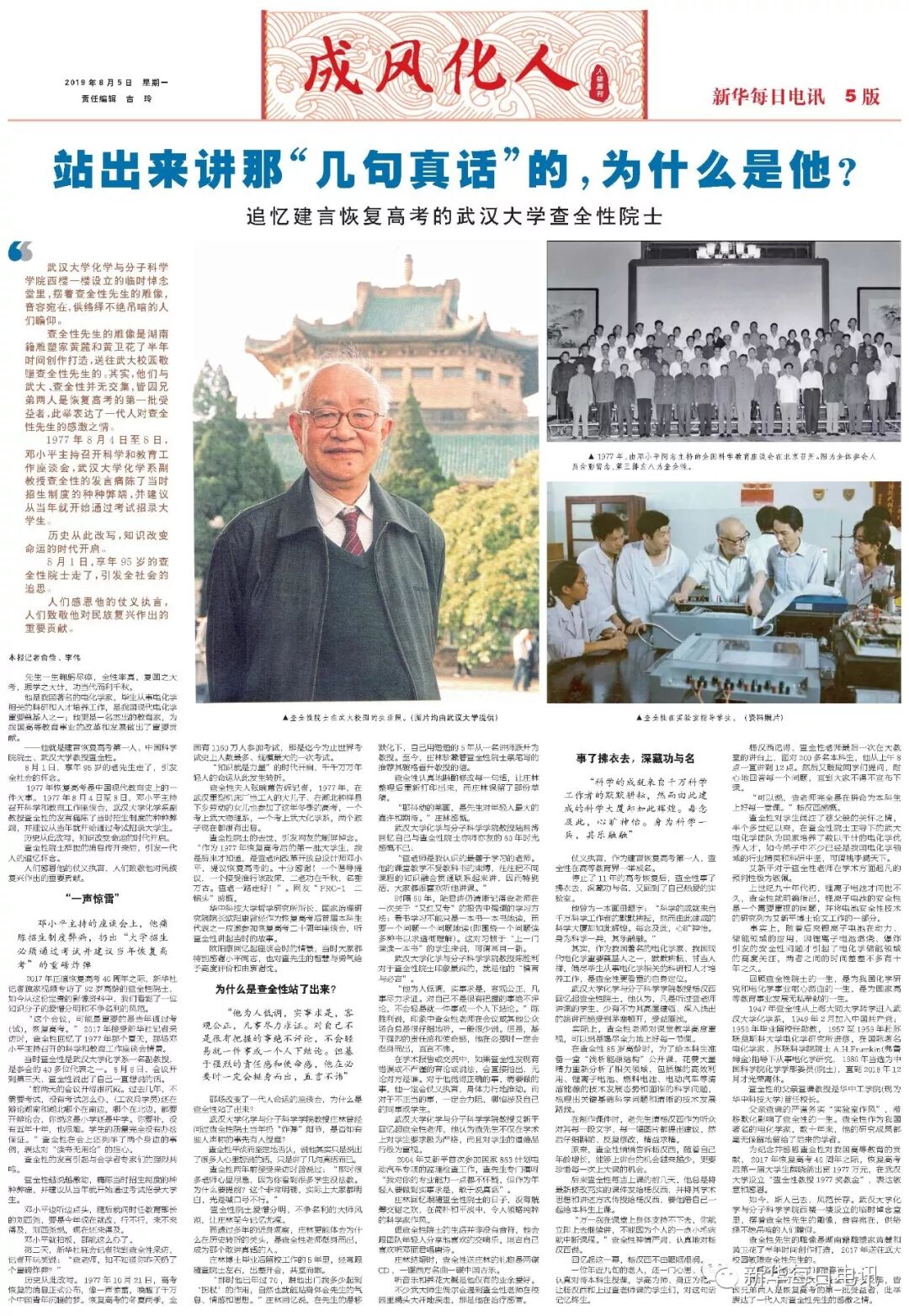 ——他就是建言恢复高考第一人、中国科学院院士、武汉大学教授查全性。