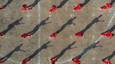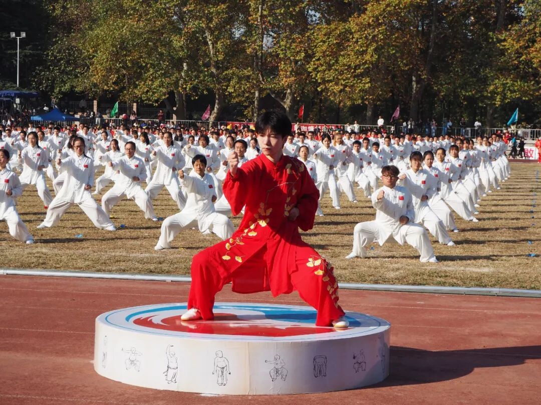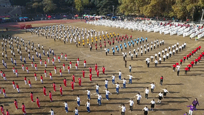同学们身着红白的练功服在天地间伸展
