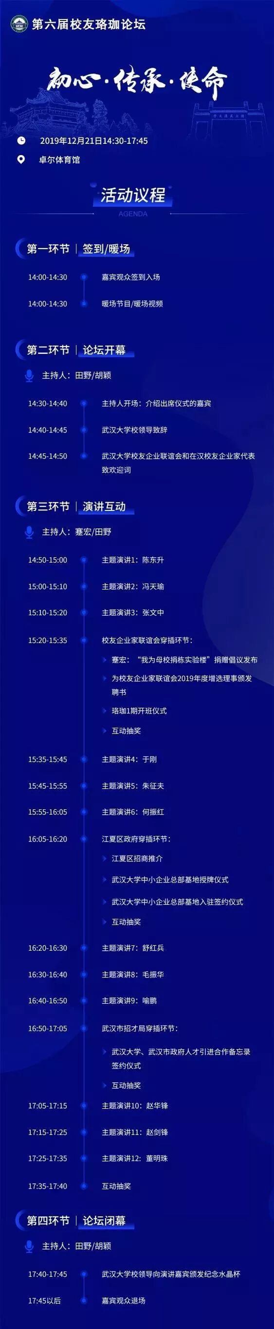 本次论坛的主题为“初心·传承·使命”。12月21日,武汉大学第六届校友珞珈论坛将在卓尔体育馆盛大启幕,众多企业家领袖、院士大家同场进行思想碰撞,智慧交流!